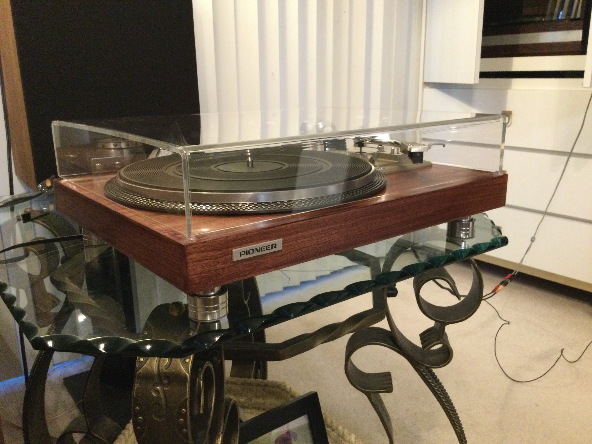 Hello, giving turntables another turn in the world is my passion. Check out my YouTube for hundreds of examples of my work. From the restoration to proper packing to insure you receive what you purchased there are no short cuts taken. For your consideration is this just about mint Pioneer pl-516 belt drive turntable that is fully working in every way. Serviced performed includes lube and adjust to internal moving parts along with flush and Deoxit applied to the speed switch, trimmer and board trimmers. Both speeds are accurate and steady and trimmer is operational. The Pioneer headshell has a Shure M91ED cartridge along with a new after stylus. Brand new platter belt just installed. Brand new dust cover just installed. Brand new aluminum aftermarket feet just installed. Original Pioneer 45 adapter is included. Table was disassembled and real cherry wood veneer was added. Corners are tight and was sanded, stained and a coat of Poly was added. See last picture for the only cosmetic faults, the anodized top plate has the typical discoloration. Some assembly will be required therefore appreciate the experienced knowledgeable buyer. My other job and family go without when video calls are required for basic setup, balance of the arm and trouble shooting the buyers system. To this date the buyer hooking one of my turntables up to his MP3 player and inquiring why one channel was out is the best of all time. You can download the manual online from several sources or contact myself for assistance as a last resort if needed. Watch video by copy and paste! https://youtu.be/VFf_ddsQgYs?si=NSQ2KFBKSSl9EpaC